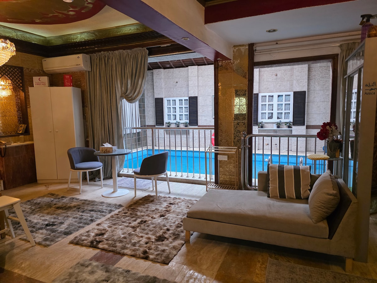Relájate en este lugar tranquilo y elegante. Para noches llenas de comodidad y una experiencia única. Está a 5 minutos de la mezquita del Profeta y a 3 minutos de la mezquita de Quba en auto. El espacio cuenta con todas las comodidades y comodidades de lujo: - Wifi gratuito disponible. - Cannab Relax - Amplio dormitorio y tranquilo espacio de estar, así como una moderna sala de estar, cocina y baño. - Dos pantallas inteligentes en el dormitorio y el salón con Netflix, YouTube, Shahid y todas las demás aplicaciones. - Disponible cerca del alojamiento todos los servicios, restaurantes y tiendas las 24 horas. El espacio ascensor disponible
