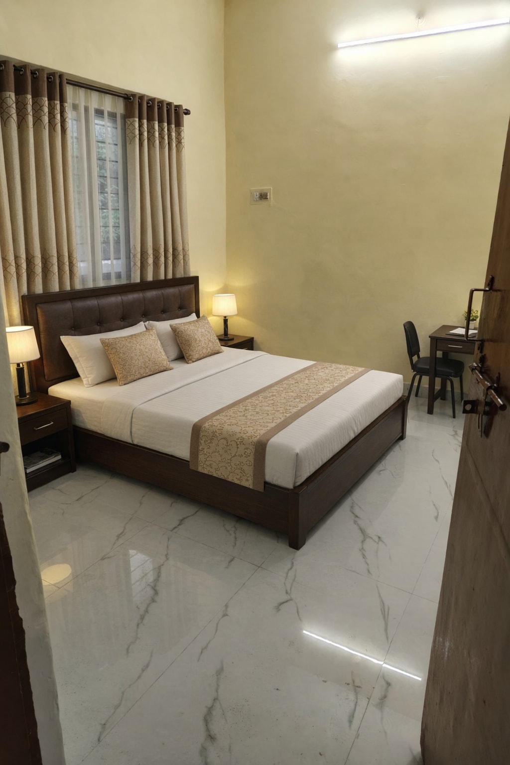 Madhuvan tiene 3 dormitorios en el primer piso. 2 habitaciones tienen baños adjuntos. El límite de 5 personas puede superarse previa solicitud con camas / colchón adicionales. Madhuvan es una casa tradicional, con comodidades básicas. Áreas comunes que compartirán todos los huéspedes, propietarios: - Sala de reuniones de oficina, - 2 balcones grandes - Despensa de autoayuda, lavadora, El balcón delantero da a Marine Drive, el lago más famoso de Raipur, dominado por el Tiranga más alto de la India y el exuberante jardín verde. El balcón trasero está abierto al cielo para secarse.