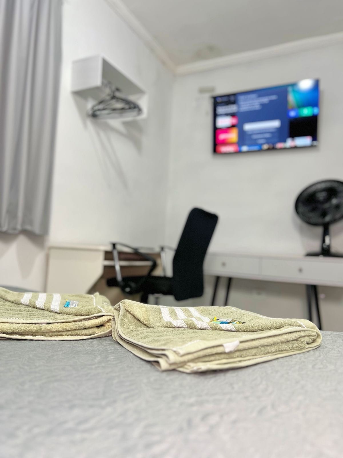 Quarto com banheiro privativo. Quarto individual com banheiro privativo. O quarto com banheiro privativo está equipado com microondas, frigobar, mesa de jantar, pratos, talheres e copos. Inclui TV Smart 43, ferro de passar roupa, secador de cabelo e enxoval de cama e banho.