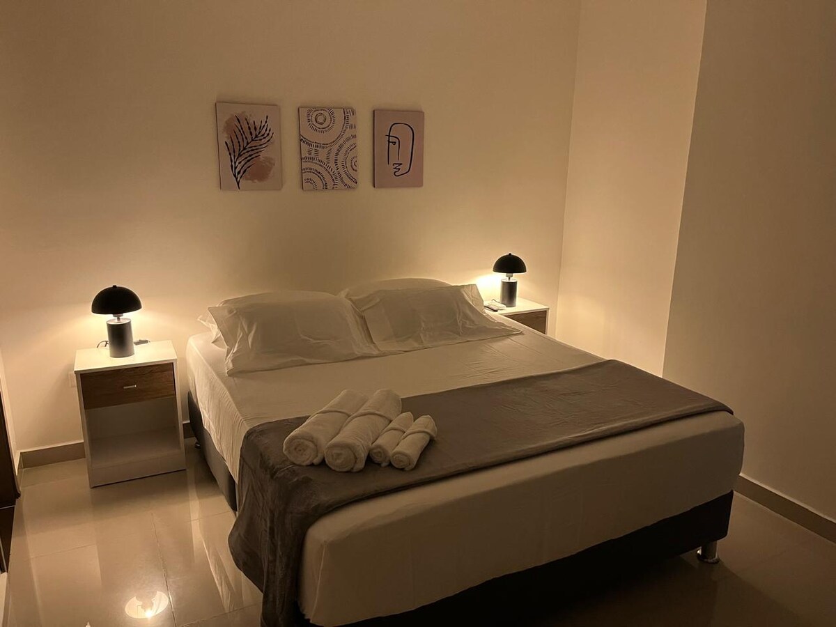 Disfruta de este lindo y tranquilo alojamiento que tiene excelente ubicación, se encuentra en un piso 5, es acogedor y cómodo, cuenta con todo lo que necesitas para estancias cortas o largas, tiene estacionamiento gratis en el sótano, entra mucha ventilación y luz, 2 aires acondicionados, edificio nuevo con zonas comunes y ascensor, el barrio es super tranquilo y hay un centro comercial, restaurantes y supermercados muy cerca. Ideal para recuperaciones por intervenciones médicas.