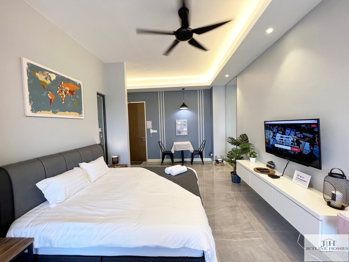 —Studio— Imperio Residence - Habitación acogedora con baño y bañera. - Agua fría/caliente ajustable. - Cama tamaño queen x1. - Almohada x2 - Armario - Despierta la mesa con el espejo. - Aire acondicionado - Wi-Fi de alta velocidad. - Vista de la ciudad - Balcón. *Estacionamiento de pago por hora De lunes a jueves RM3, RM1 posterior Viernes a domingo RM4, posterior RM1 Salida después de la hora establecida 40 RM por hora Tarjeta perdida 200 RM Llave rota rm50