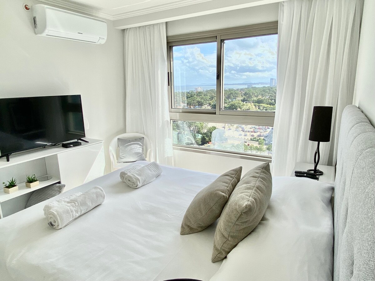 Moderno apartamento para 2 personas totalmente equipado con espectacular vista al mar y la península con 2 balcones, situado a cuadras del centro y de las playas mansa & brava. Incluye el uso de cochera propia, amenities de alta categoría como piscina interna y externa, sauna, gimnasio, business lounge y recepción atendida 24h. Ideal para relajarse y disfrutar de Punta del Este durante todo el año o combinar descanso y trabajo ya que dispone de una conexión rápida de internet (200 Mbps).