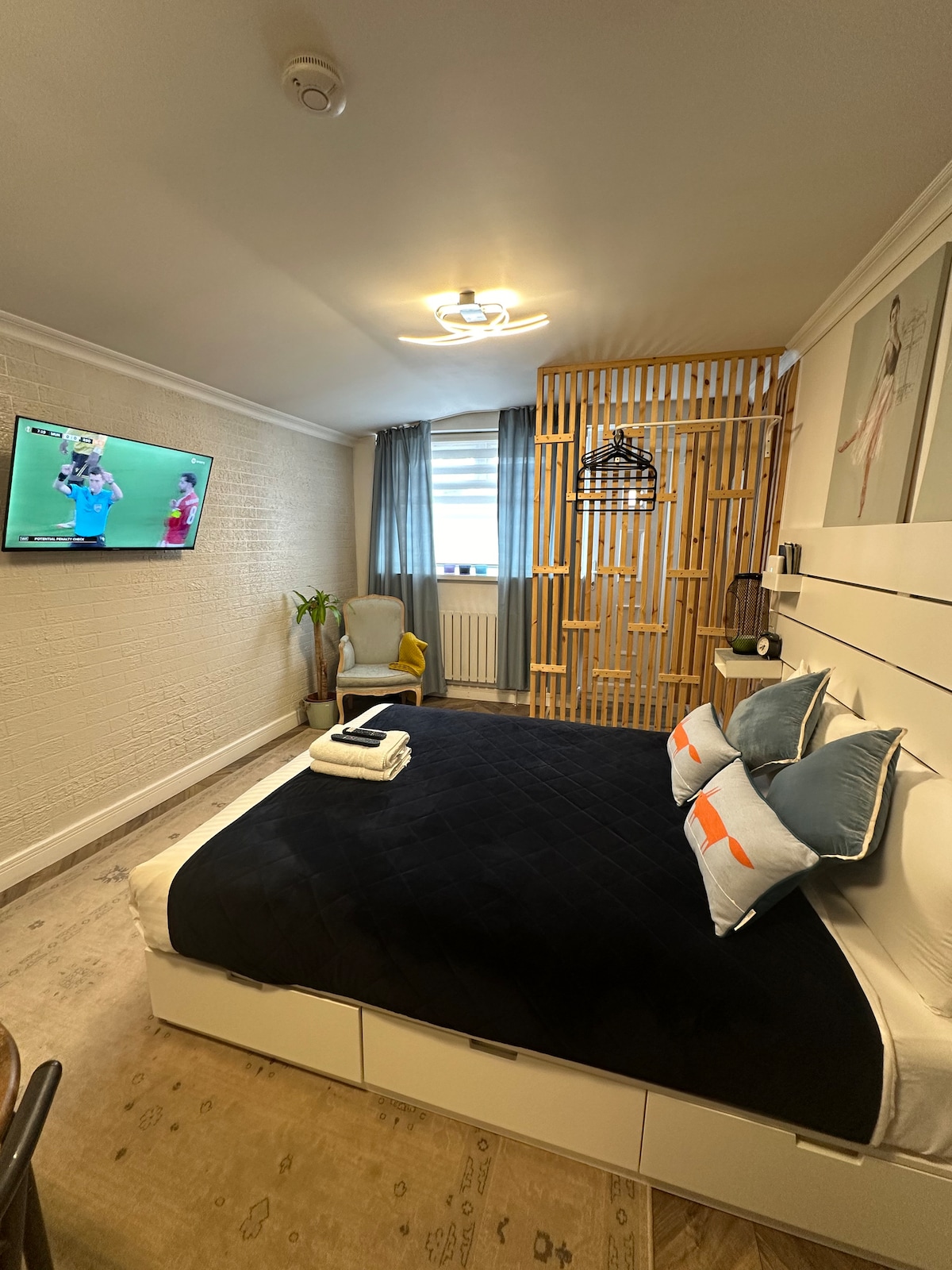 Esta es una habitación independiente en la planta baja con baño con ducha, cocina pequeña y entrada privada. Caja fuerte con llave para un registro autónomo rápido y sencillo. Este es un espacio recientemente reformado, con una gran ventana y persiana que lo hace muy luminoso y brillante, pero con privacidad. Hay una cama doble con cajones de almacenamiento debajo, un vestidor con perchero, TV montada en la pared y una mesa desplegable montada en la pared con sillas plegables que hacen un espacio útil para comer/trabajar. Aparcamiento en la unidad