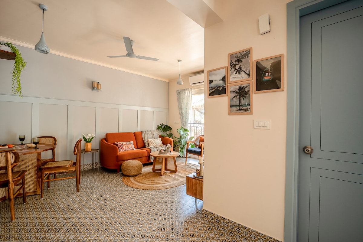 Una joya escondida en el código postal más elegante de Panjim. Nuestro ático 2BHK tiene una terraza privada y está a pocos pasos de la playa de Miramar. Un santuario goano rodeado de vegetación; la sala de estar de planta abierta y amplia se transforma en un espacio elegante después de la puesta del sol con iluminación ambiental de diseño. El famoso paseo marítimo, tiendas de comestibles y cafeterías están a solo un paseo. Fontainhas y casinos están a pocos kilómetros en coche. Disfruta de wifi de alta velocidad si trabajas desde casa. PD: ¡Busca pavos reales por la mañana!