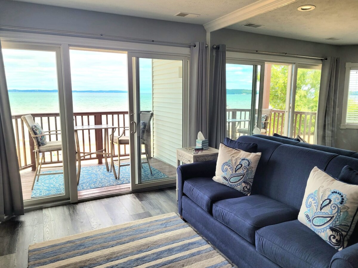 This beautifully remodeled beachfront condo is on the second floor and sits directly on sparkling East Grand Traverse Bay! Your private patio provides a front seat view of the bay and sandy beach below. Natural light fills the open concept floor plan. Savor your morning coffee or evening wine from the private deck, while watching the waves on East Bay. One bedroom, one bathroom, 850 square feet, fully equipped kitchen and laundry. Convenience + style = enjoyable relaxation!