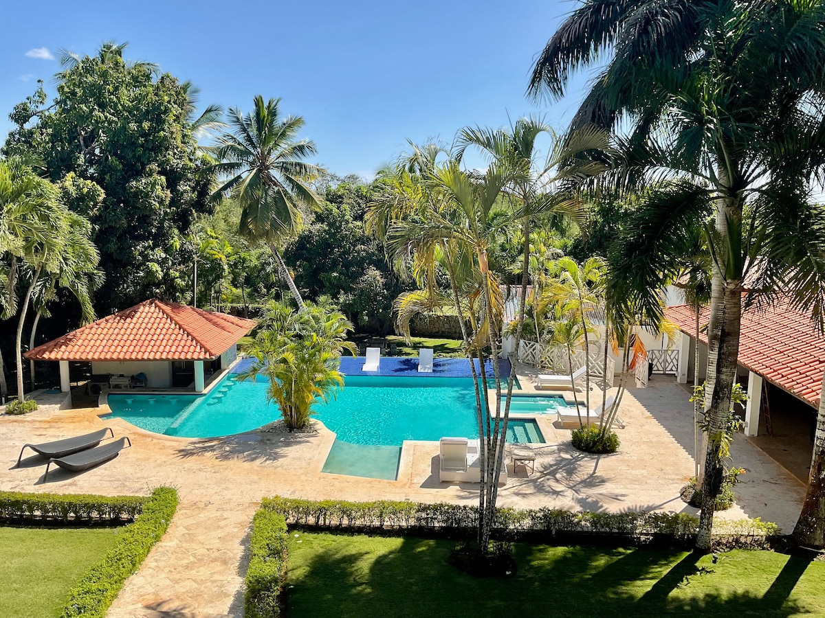 A solo 1 minuto caminando de la playa privada (visible desde la puerta del apartamento), ubicado en área más exclusiva de Bayahibe, Dominicus. Dentro del exclusivo resort Cadaqués: 3 piscinas, muelle privado, parque acuático, restaurante, bar-café, jardines tropicales, Cama king cómoda y sábanas de 300 hilos, A/C de 24,000 BTU, silla columpio (hasta 350 lb), cocina equipada, WiFi rápido y Smart TV, libros, juegos de mesa. Todo listo para que vivas una estadía inolvidable y cómoda en el paraíso!