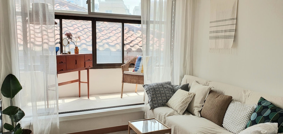 Experience the serene & cozy vibe of Under Cloud—a spacious 50m² home with two charming bedrooms, brick-finished living room, beautiful kitchen & bathroom, extra storage room, and a cozy balcony +hammock. In a quiet yet convenient area, offering easy access to Seoul’s best spots and the airport. Please click “Show more”. ☛ On foot Hongdae: 15min | Hapjeong Stn.(Line 2/6): 8min | 2 Malls: 5min ☛ By bus/subway Incheon Airport: 50min | Old Palaces: 30–40min | Myeong-dong: 30min | Gangnam: 40min
