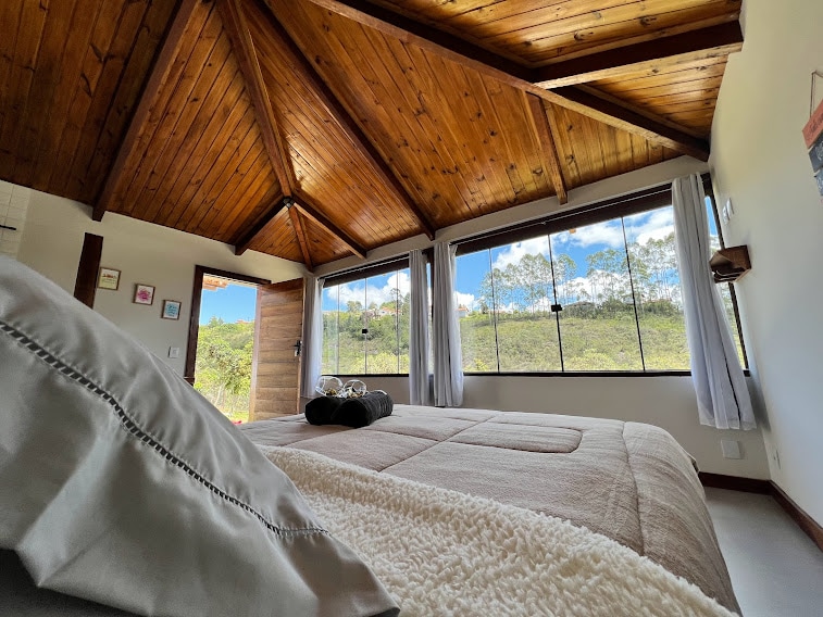 Acogedora cabaña con vista privada a las montañas, hermosa al atardecer. Ideal para parejas que buscan un refugio tranquilo para el fin de semana. Ambiente romántico con bañera de hidromasaje en la habitación. Nuestro espacio está muy bien ubicado, cerca del centro comercial del pueblo, lo que permite disfrutar de deliciosos paseos. El alojamiento incluye un delicioso desayuno artesanal hecho en la casa, entregado en la comodidad de su habitación a la hora elegida.