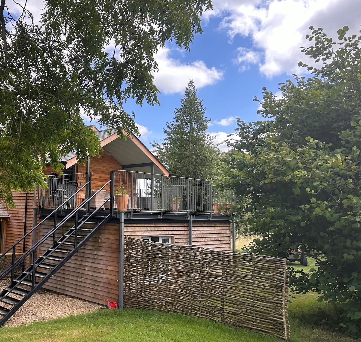 Este es un anexo independiente sobre un garaje doble (ten en cuenta los ángulos bajos del techo en algunos lugares) con una puerta independiente. Tiene una cama tamaño king con algunos asientos, un televisor y una mesa de comedor. Hay una pequeña cocina americana que incluye microondas, nevera, hervidor de agua y tostadora. El baño tiene una ducha eléctrica básica y los servicios habituales. Hay internet disponible. Si quieres traer a un niño, ponte en contacto con nosotros antes para comprobar si es adecuado. Hay aparcamiento en la carretera principal o enfrente en un cierre.