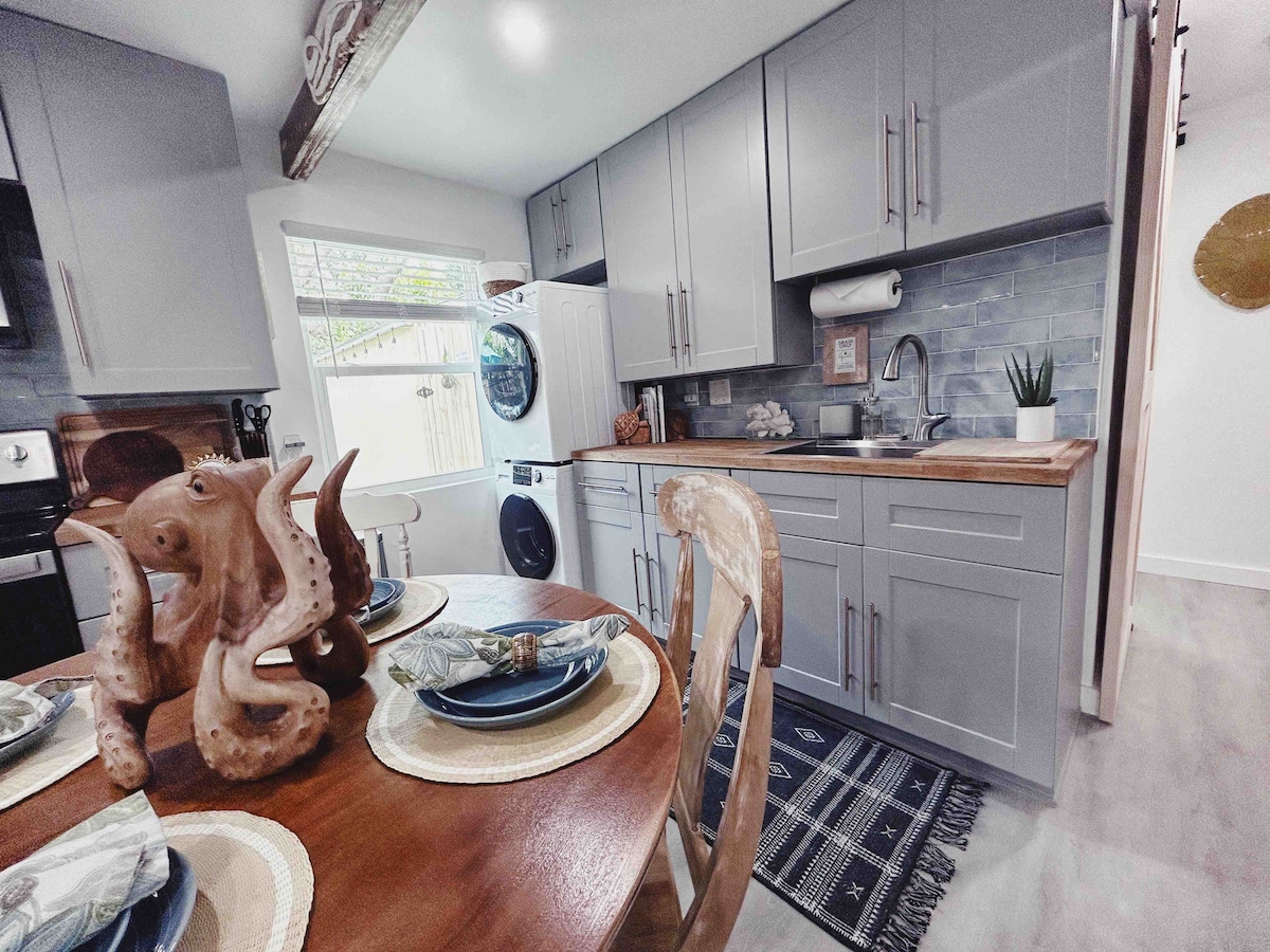 Siéntete como en casa en nuestro apartamento totalmente privado, en un vecindario tranquilo con todo lo que necesitas para una estancia relajante. Relájate en la comodidad de una espaciosa cama tamaño king y un acogedor sofá cama tamaño queen que proporciona un amplio espacio para huéspedes adicionales. Lavadora y secadora recientemente agregadas dentro de la unidad para un lavado rápido. Con su propia entrada privada y estacionamiento seguro y gratuito, disfrutarás de la libertad de ir y venir a tu antojo. Mantente conectado con wifi de alta velocidad gratuito y televisores inteligentes en el dormitorio y la sala de estar.
