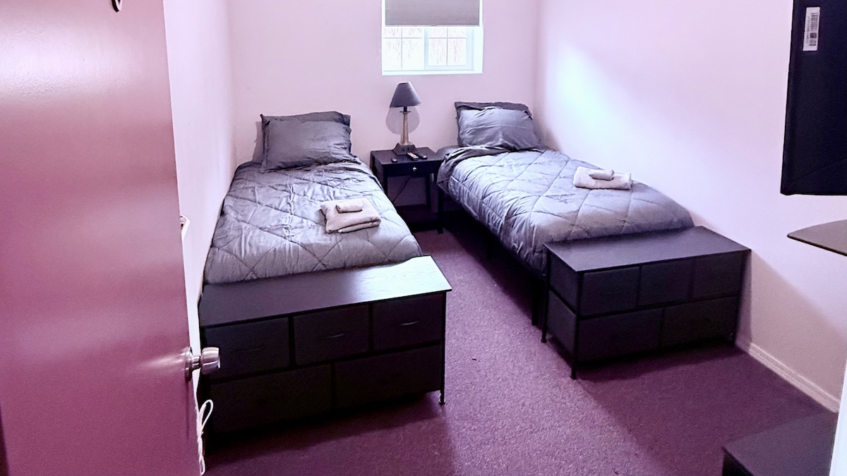 Este dormitorio con llegada autónoma se encuentra en el segundo piso de este albergue céntrico de 3 pisos y 20 habitaciones con vistas al centro de la ciudad. Convenientemente ubicado a poca distancia a pie de varios restaurantes, a 5 minutos del centro de la ciudad y a 9 minutos del aeropuerto. La habitación cuenta con cama tamaño queen, escritorio, TV inteligente y mininevera. Lavandería, gimnasio y wifi gratuitos incluidos. Esta habitación comparte acceso a 4 baños, cocina, lavandería y áreas de patio trasero vallado.