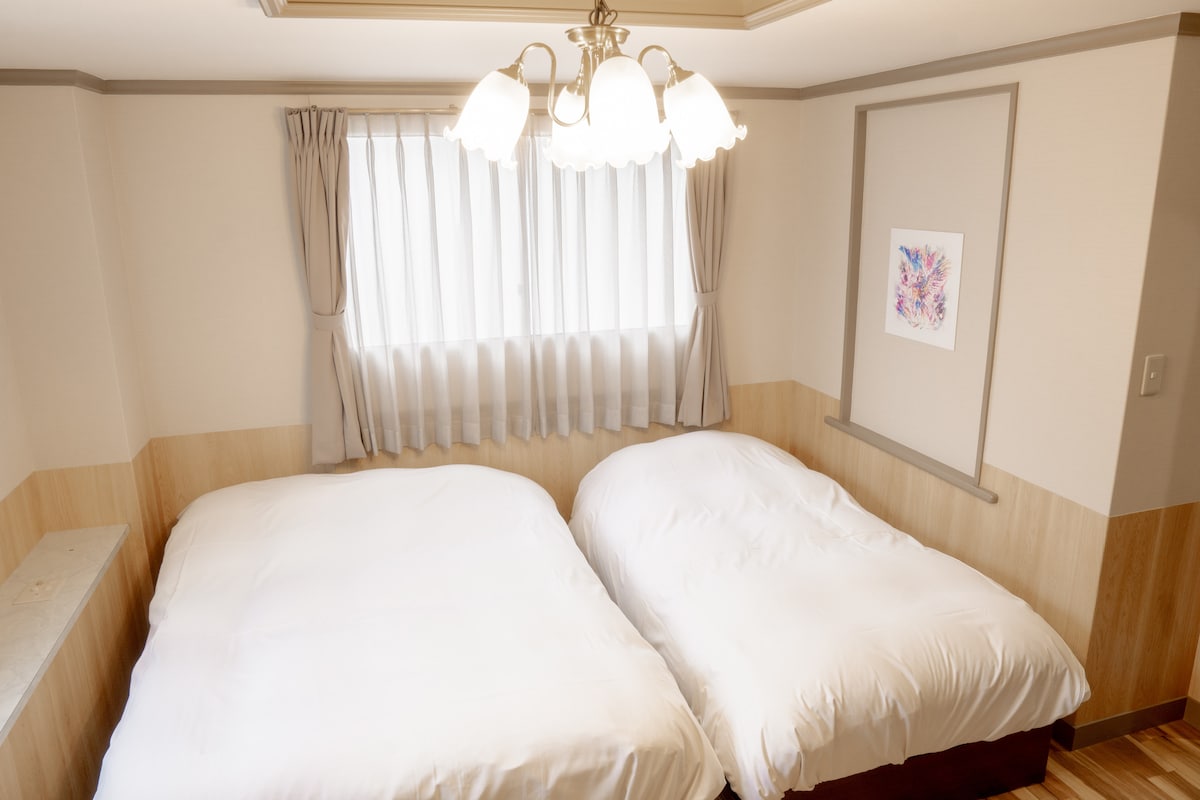 A 5 minutos a pie de la estación de Katsuyama en el centro de la ciudad de Matsuyama. La espaciosa habitación confort con 2 camas tamaño queen + 2 camas individuales es perfecta para familias y viajes en grupo. Todas las habitaciones están equipadas con microondas, nevera y hervidor de agua.Hay un espacio de cocina gratuito y una lavadora en el piso delantero, lo que es conveniente para estancias largas. Disfruta de una estancia agradable tanto para hacer turismo como para hacer negocios.