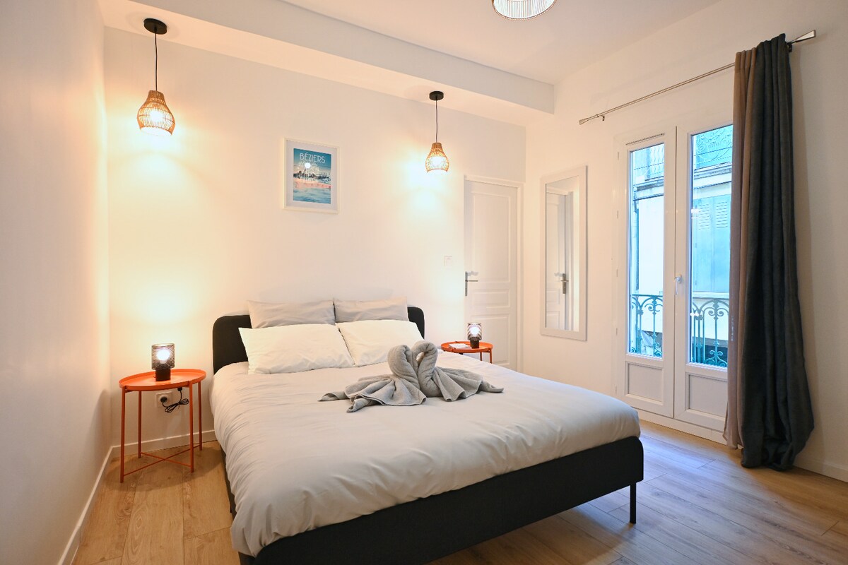 Profitez d'un logement élégant et central face aux Halles de Béziers, élues "plus beau marché de France 2025". Cet appartement de deux pièces climatisé et décoré par une architecte d'intérieur se trouve au troisième étage. La chambre est au calme et le séjour dispose d' un canapé convertible et de WC séparés. De plus, rénové en 2025, cet appartement est écologique et classé A+. Ce logement n’est pas adapté aux personnes à mobilité réduite. Logement pas adapté PMR