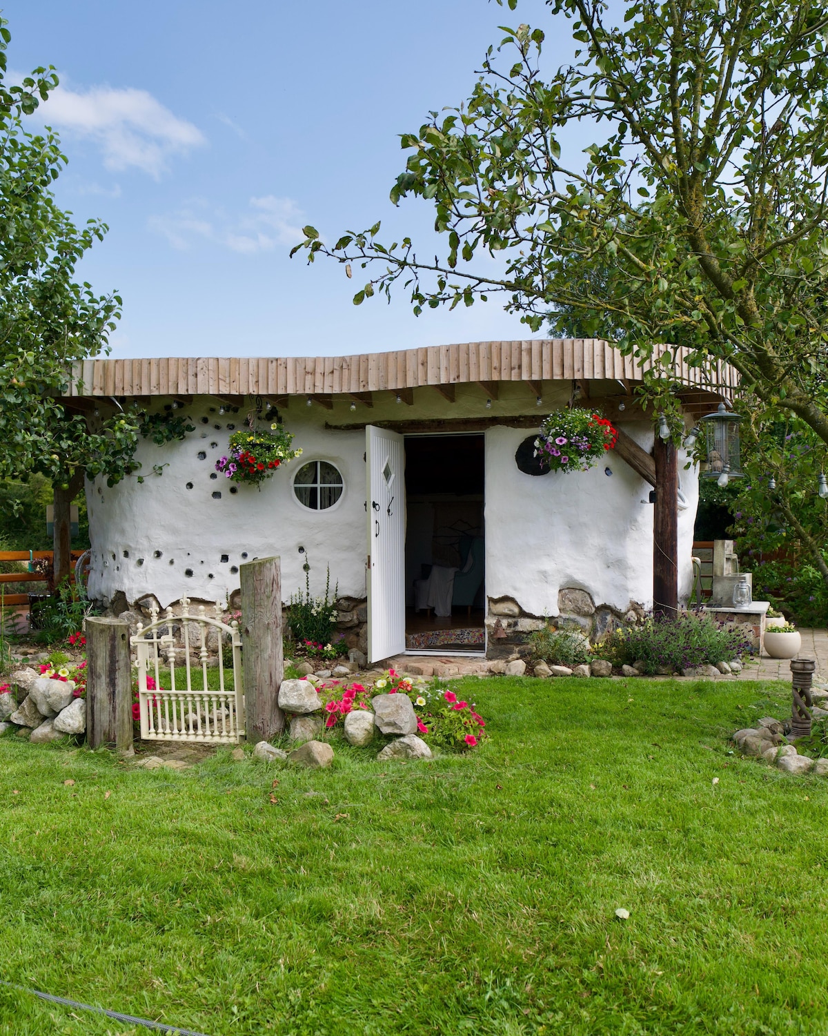 Te encantará esta escapada romántica. Ubicada al final de nuestro jardín, esta hermosa cabaña de adobe construida por el anfitrión es acogedora y diferente. La cabaña tiene su propio jardín encantador y una terraza envolvente donde puedes relajarte en el jacuzzi (de febrero a noviembre) con vistas al campo o preparar una deliciosa comida en la cocina del patio.La sala de estar de planta abierta dentro de la cabaña es encantadora con las ventanas redondas, la pared de la botella de vidrio, los sofás de mazorca y la cocina de roble a medida y una cómoda cama doble. Calefacción central.