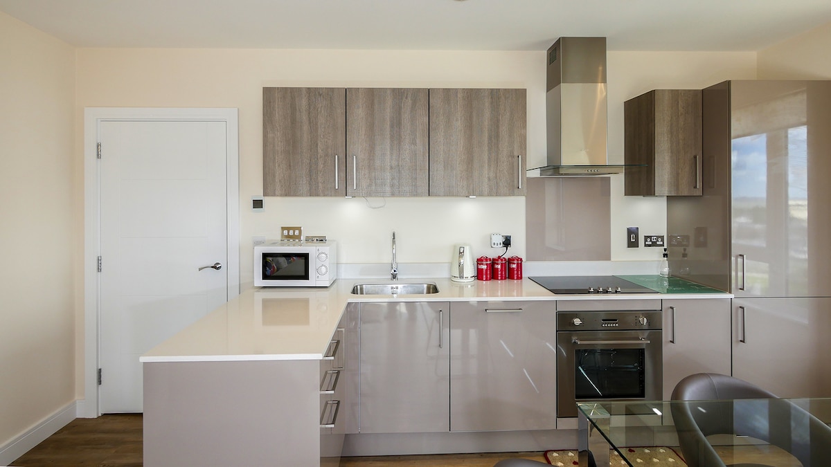 Moderno apartamento de 1 dormitorio con impresionantes vistas, perfecto para un máximo de 4 huéspedes. El dormitorio cuenta con una cómoda cama doble y armario, mientras que la cocina, el comedor y la sala de estar de planta abierta ofrecen un sofá cama doble, TV inteligente, Wi-Fi y juegos de mesa. Disfruta de estacionamiento gratuito y un espacio luminoso y elegante a solo 1 minuto a pie de ASDA. Ubicación céntrica ideal para explorar, relajarse junto al río o trabajar lejos de casa.