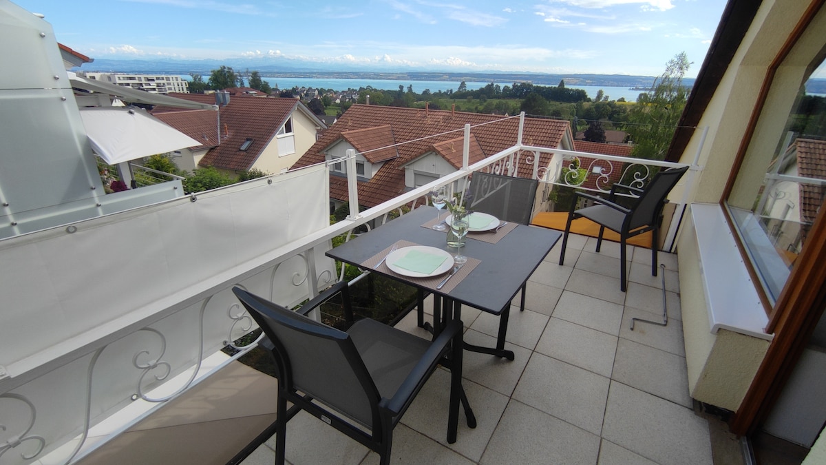 Acogedor apartamento en el ático con entrada independiente y escalera, con baño limpio, cocina pequeña y un balcón con vistas al lago de Constanza y los Alpes suizos. Disfrute de su té de la mañana o café en el balcón y se siente como si estuviera en un retiro. Uso gratuito de la cocina comunitaria con equipo completo. Estacionamiento privado frente a la casa, también espacio para caravanas y caravanas. Alquilamos la habitación de forma semanal.