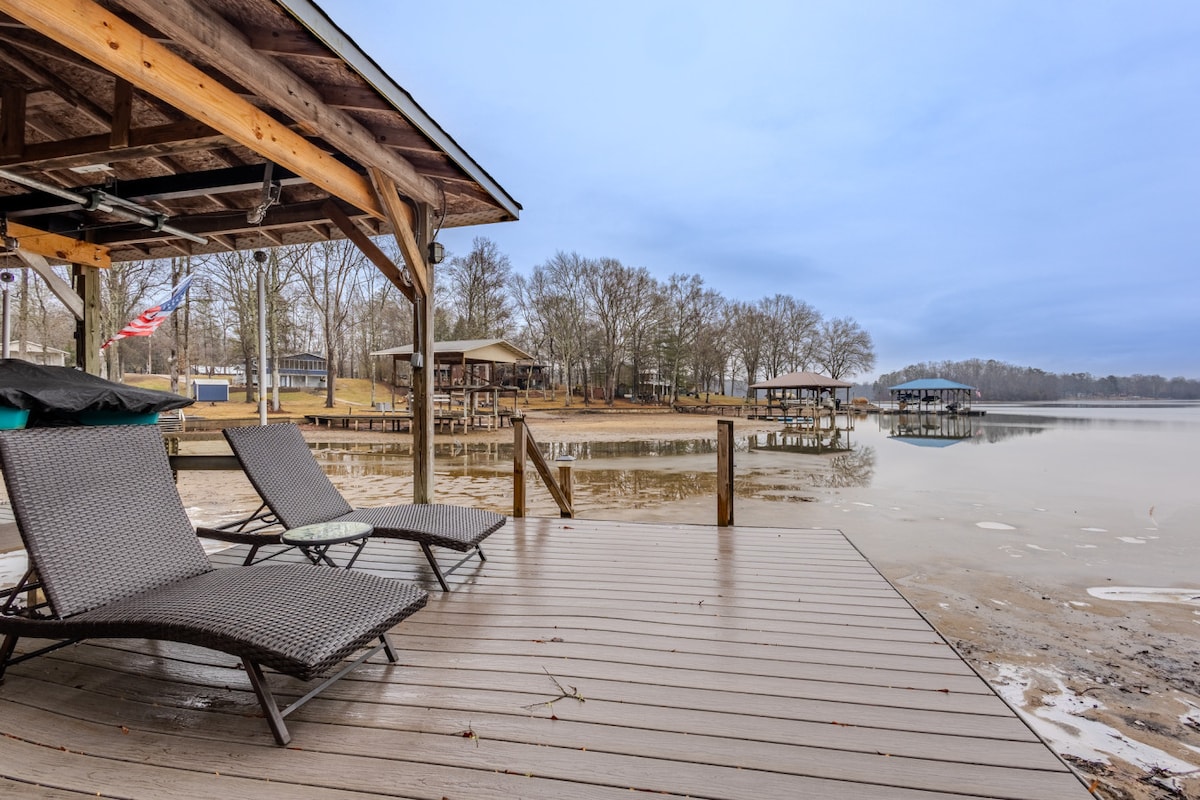 Relájate en esta impresionante obra de arte remodelada. Disfruta del jacuzzi y de la terraza con 2 porches con vistas impresionantes al lago. La casa fue construida con 2 salas de estar separadas, techos de vigas altas y detalles inmaculados para una sensación lujosa pero encantadora. Los niños disfrutarán de la habitación con literas hecha a medida en el sótano con su propia cocina y sala de estar. Trae tu barco o moto acuática y disfruta de la rampa y el muelle privados. Los kayaks, la zona de picnic y el pozo de fuego son tuyos para disfrutar.