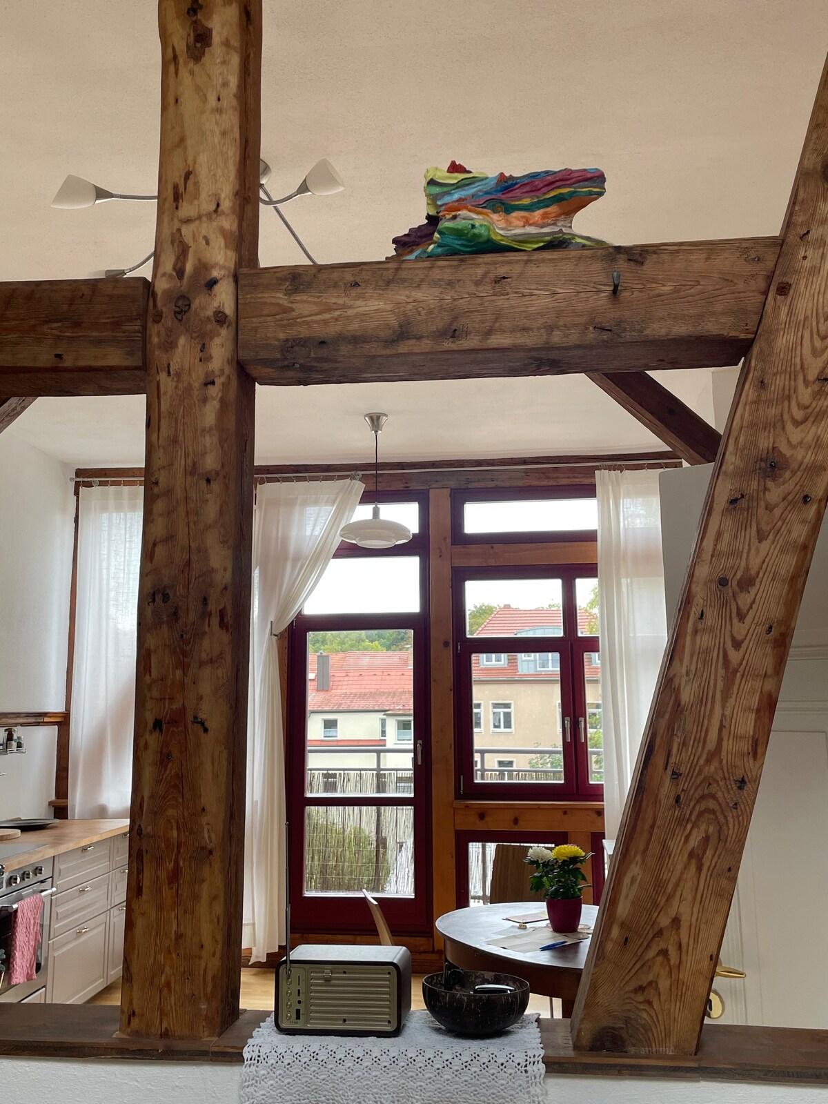 El apartamento se encuentra a 1 minuto del mercado y del centro de la ciudad, con vistas directas a la Herderplatz. Se encuentra en un edificio protegido, que fue construido en 1570. El edificio ha sido restaurado y renovado con mucho mimo y con materiales tradicionales como la arcilla. El apartamento está ubicado en el segundo piso y tiene una de las vistas más bonitas de Herderplatz. Es luminoso y soleado.