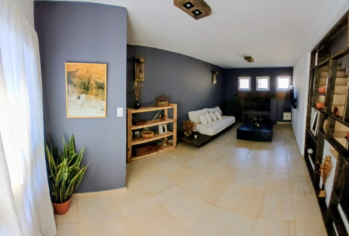 Casa con alma, ideal para familias y amigos. Lugar para 11, ideal 8, dos cuartos matrimoniales. Bienvenido a nuestro refugio en Sierras Chicas. Somos una familia de 7, nos gusta recibir y que sientan como hogar. Te ofrecemos una casa con historia, por las creaciones artesanales del anfitrión. Madera, hierro y cariño se combinan para crear ambientes acogedores. Naturaleza, jardín, pileta, ubicación privilegiada cerca del aeropuerto, de canchas de golf y de atractivos de las Sierras Chicas.