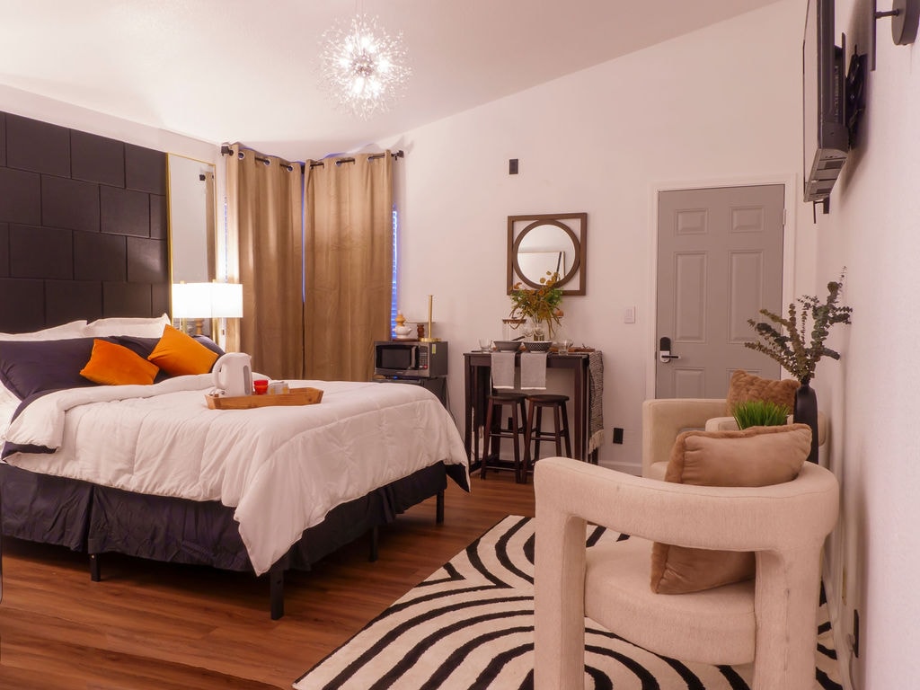 El Black and White Bungalow es un estudio moderno pero rústico recién remodelado. Ubicado en un barrio tranquilo de la ciudad de Yuba, es el lugar perfecto para relajarte mientras estás en la ciudad. Cuenta con techos abovedados de 11 pies, encimeras de granito, calentador de agua instantáneo y mucho más. Decorado con gran atención a los detalles, no puedes evitar amar este espacio.