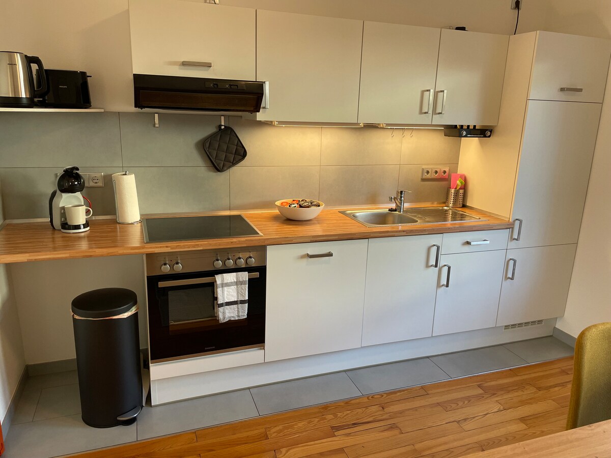 El apartamento totalmente amueblado está equipado en la cocina con una cafetera Nescafé Dolce Gusto, horno, placa de 4 fuegos, nevera/congelador, hervidor de agua, tostadora, sartenes/ollas, vasos, vajilla y cubiertos. También se puede utilizar la televisión, internet y el enchufe de red. La conexión Wi-Fi y el aparcamiento son gratuitos. Se proporciona un equipo básico de materiales de limpieza (productos de limpieza, aspiradora, escoba, etc.).