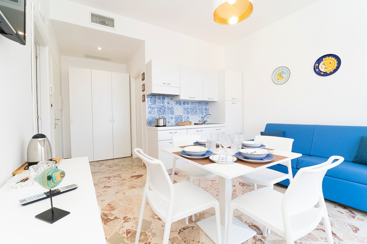Vacaciones en nombre de la independencia. Administra tus días de acuerdo con lo que te apetezca hacer y come a la hora que prefieras; en resumen, disfruta de unas vacaciones regeneradoras para dar a luz a un punto de inflexión. Este encantador apartamento con vistas al mar puede alojar a 2 adultos y 2 niños o 3 adultos; pero también es adecuado para 4 amigos e incluye un amplio balcón, un dormitorio, un baño privado, una sala de estar con una cocina equipada, un comedor y un sofá.