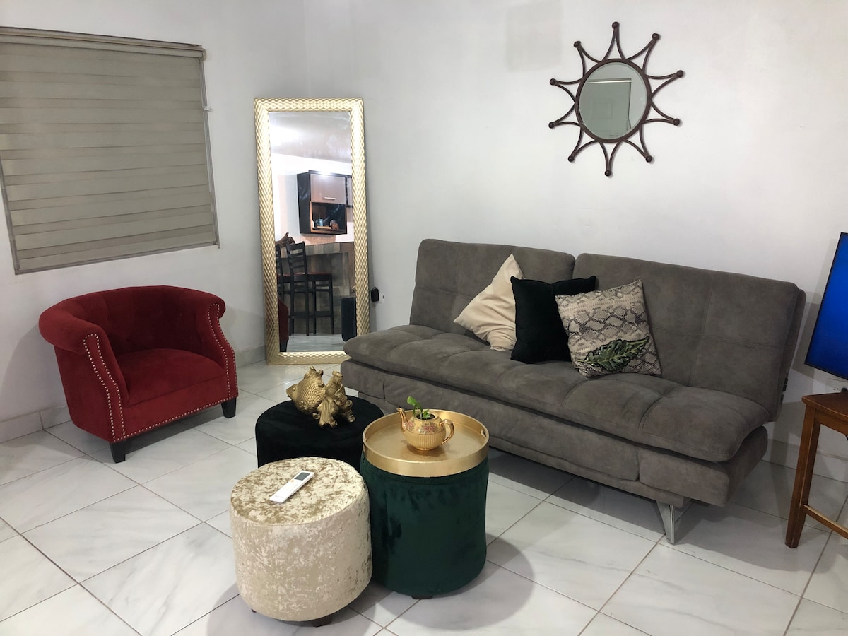 An excellent apartment located in one of the most central and sought after areas of Mexicali. We are 5 minute from the Cross border. It has controlled access, an office for your convenience, appliances and new and modern furniture, 2 bedrooms, 1 bathroom, kitchen, TV area, laundry and service room. Excellent for business and family trips!