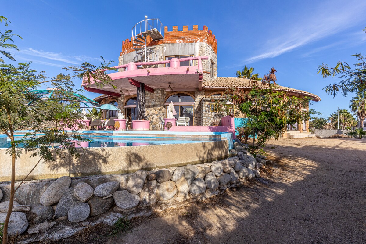 Es una casa en forma de castillo enfrente de la playa, cuenta con una alberca grande y espacio para pasar momentos agradables.