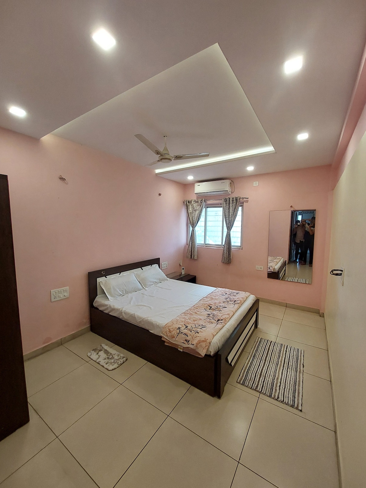 Modern furnished top-floor 1BHK in Balajinagar, Sangli, near Kupwad & Miraj MIDC. Bright living room with large glass window and open views, 55” Smart TV, AC,high-speed WiFi and sofa-cum-bed. Fully equipped modular kitchen, washing machine, bedroom with work desk, hot water and parking. Ideal for corporate stays, couples and small families. Self check-in available.