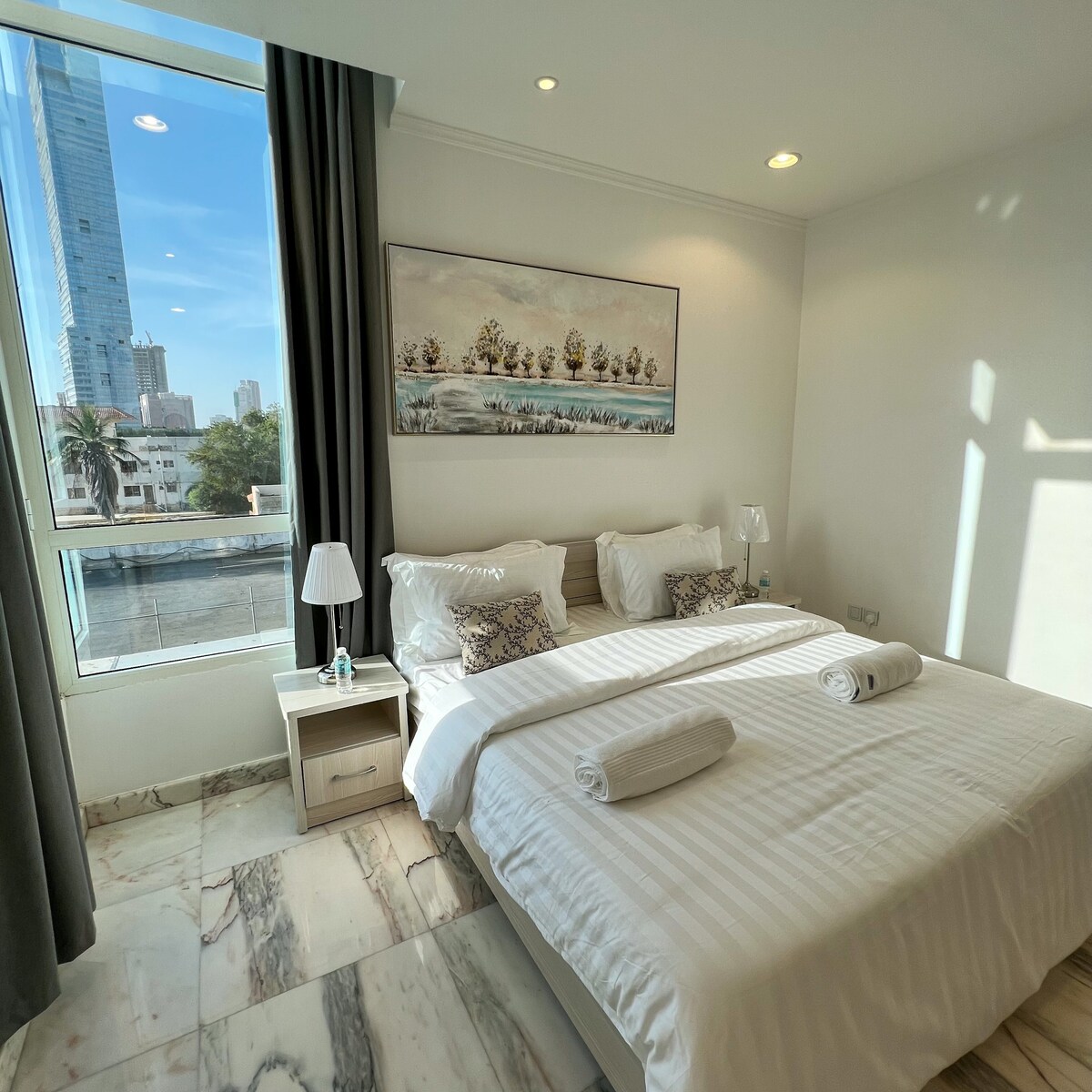 Bienvenido a tu lujosa estancia en Doha. • Ubicación privilegiada en The Pearl. • Luminosa y espaciosa sala de estar y comedor con balcón con vistas al horizonte de Doha. • Cocina abierta totalmente equipada con electrodomésticos. • Tres baños (dos con ducha). • Dos amplios dormitorios con camas tamaño king (4 camas + sofá + colchón). • Balcón amplio con barbacoa. • Cortinas opacas motorizadas. • Acceso al gimnasio, sala de juegos para niños, sauna de vapor y área social con mesa de billar, etc. • Acceso privado a la playa y la piscina.