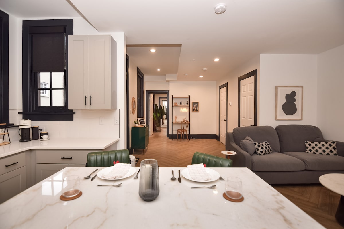 Disfruta de tu estancia en este apartamento recién remodelado en un edificio histórico a lo largo del río en el centro de Harrisburg. El aparcamiento está incluido, a pocos pasos de tu entrada privada. Este apartamento de 1 dormitorio y 1,5 baños cuenta con muebles elegantes, una cocina gourmet con electrodomésticos Samsung y una barra de comedor de mármol, TV inteligente, espacio de trabajo dedicado, medio baño, baño completo privado completamente revestido de azulejos y lavadora y secadora en la unidad. Encanto histórico con todas las comodidades modernas, ¡a pocos pasos de todo el centro de la ciudad!