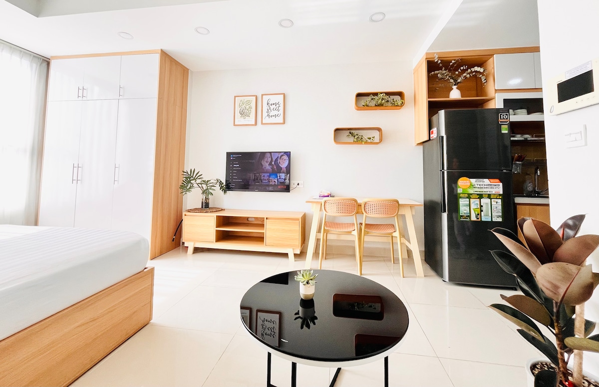 Establecidos en 2023, ofrecemos apartamentos con servicios de alta calidad para estancias cortas y largas ubicados justo en una calle concurrida con famosas cafeterías, restaurantes, Circle K y tiendas de comestibles cerca y a solo unos minutos a pie de la calle peatonal Bui Vien y del parque Tao Dan. Rentables en comparación con los hoteles, ofrecemos apartamentos de 1 dormitorio con servicios, privacidad, estilo moderno, cocina, balcón, puertas y ventanas insonorizadas, espacio de escritorio para trabajar, jardín en la azotea, ascensor, limpieza regular y las comodidades de un «hogar lejos del hogar».