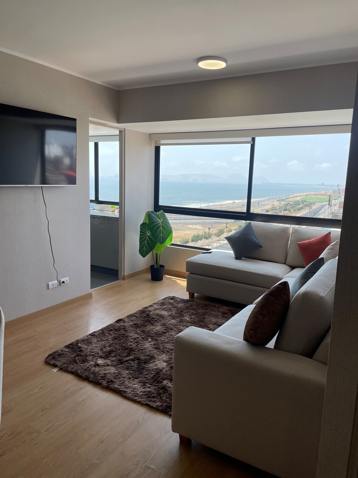 Departamento con hermosa vista al mar, cerca al Aeropuerto y de los mejores lugares turísticos de Lima, amoblado con todas las comodidades. Consta de: Sala, escritorio, Kitchenette, 1 Dormitorio con cama queen, 1 baño y una Terraza con vista al mar. Con áreas sociales: Sala de Cine, Sala de juegos, Patio con Fogón, Lavandería, Sala de Adultos, Gimnasio, Sauna, Ambientes de Parrillas, Terraza con Tina de hidromasajes, Piscina para adultos y niños.