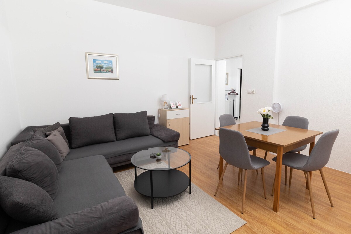 Kompletno renoviran STAN u Vinkovcima. Opremljen sa: - kuhinjom (pećnica, hladnjak sa zamrzivačem, mikrovalna pećnica, kuhalo) - dnevni boravak (klimatizacija, krevet na razvlačenje, izlazak na balkon, Smart TV, free WiFi, Netflix) -kupaonica (walk in tuš, perilica rublja, sušilo za kosu, ručnici) - spavaća soba (udoban bračni krevet, Smart TV) Self check in i check out- zajamčena privatnost. Blizina trgovina, kafića, restorana, centra grada (5 min), željezničkog kolodvora, besplatan parking.