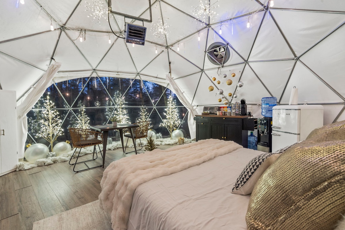 Bienvenido a Campfire Hollow, el único alquiler de domos geográficos en Table Rock Lake y una de las estancias más únicas de los Ozarks. Esta temporada de vacaciones, el domo se transformará en una bola de nieve: una experiencia navideña encantadora y única en la vida. Del 14 de noviembre al 31 de enero, sumérgete en un acogedor paraíso invernal y en la magia de dormir dentro de lo que se siente como una verdadera bola de nieve bajo las estrellas. Bebe chocolate caliente, mira la nieve caer a través de la ventana panorámica y crea recuerdos de vacaciones que nunca olvidarás.