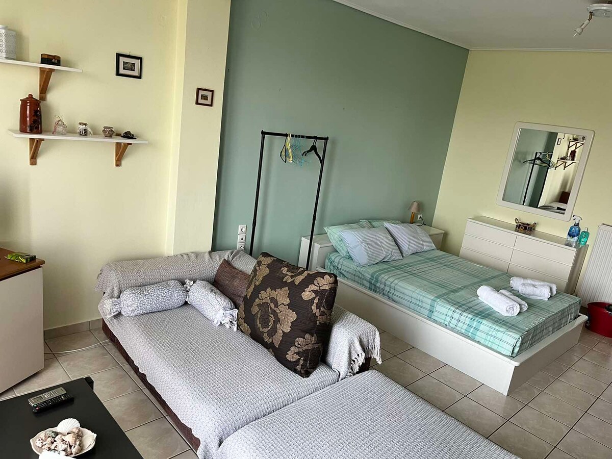 Apartment in the center of Mytilene, close to the market, the harbor, and the taxi station. You can explore all the attractions on foot. The apartment is fully equipped. It can accommodate 2 people in a double bed and 2 people on a sofa bed in the living room.