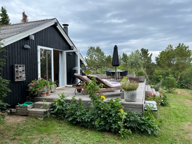 Nueva casa de campo privada de 2018 con hermosas vistas y ubicación, que alquilamos si quieres cuidarla:) Todo es luminoso y acogedor. La casa está muy bien ubicada en la propiedad con una vista fantástica sobre el paso de las estaciones en Mols Bjerge. Hay una gran cocina/sala de estar y una sala de estar con estufa de leña, baño y tres bonitas habitaciones con literas o camas dobles. Hay una gran terraza al sur y al oeste alrededor de la casa.