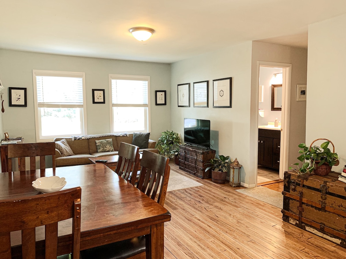Bright, updated, and well equipped house with lots of local art displayed.You're 1 block from IU campus on the east side. Offering 2 bedrooms, one bath, an open kitchen/living room, 3 off street parking spots, and a large private fenced yard with a fire ring and hammock hooks. Close to shopping, restaurants, and recreation! This is an ideal spot for all things Bloomington. A record player and games, for your enjoyment.