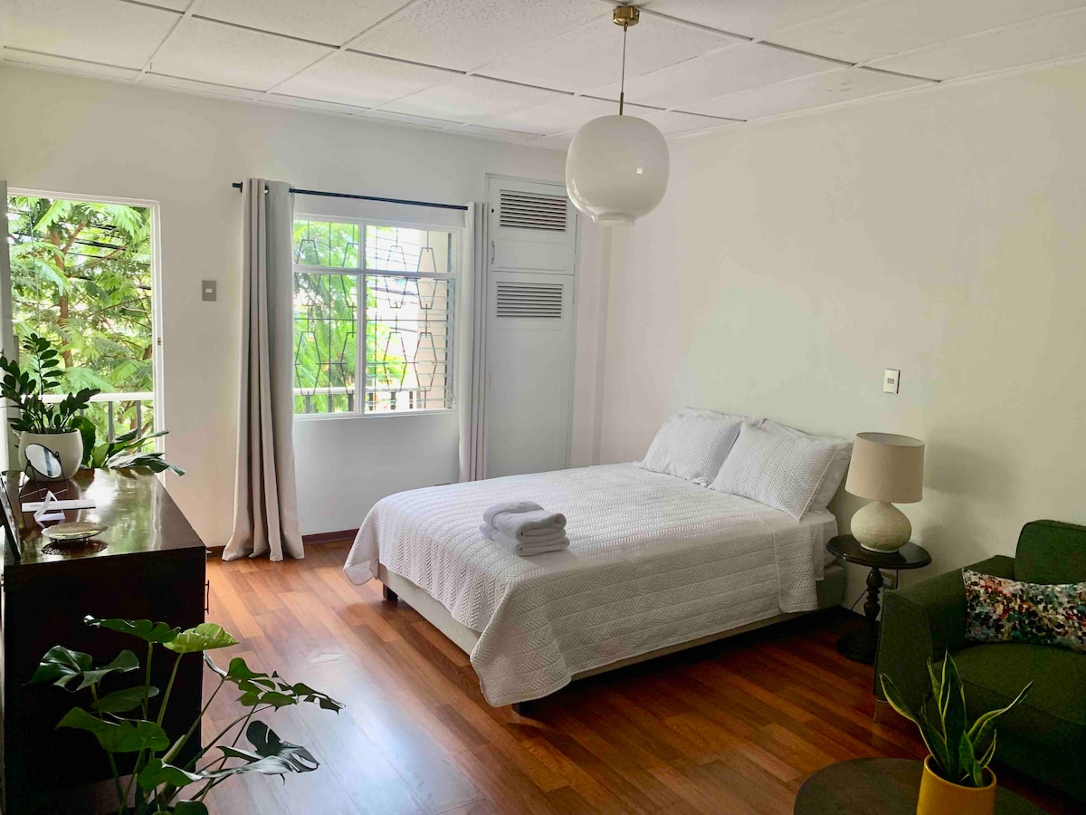 You are looking at the main room of a Mid-Century renewed house where I grew up. Its located in the heart of San Pedro, a lively University Town close to San Jose downtown and other emerging neighboorhods . This room is bright and very spacious, it has a balcony and your private bath with a huge walk in closet. You will have access to a big living room, with a fireplace as the focal point where you can relax. A fully equipped kitchen, a terrace and a shala to meditate, do yoga or relax.