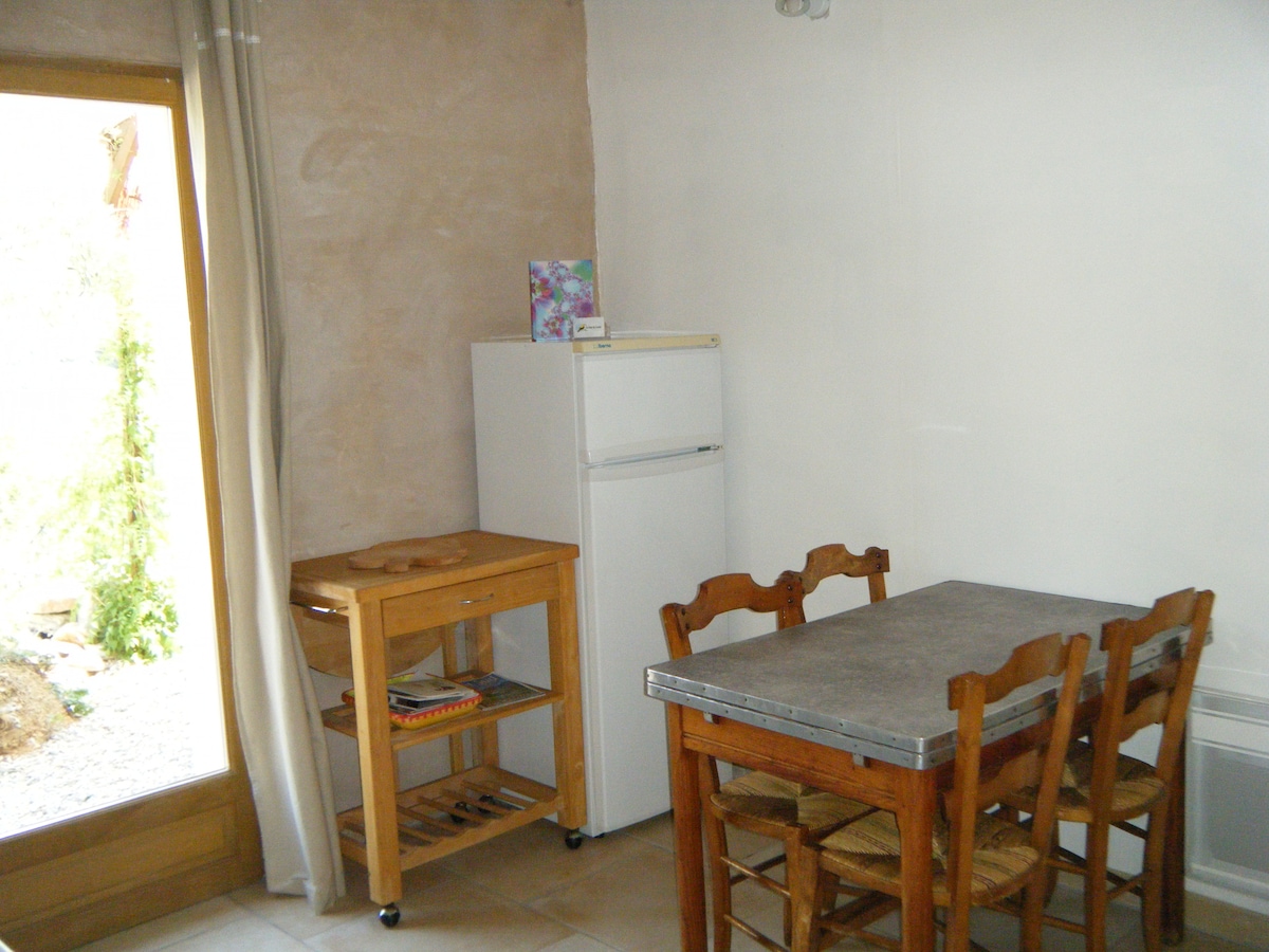 Bonito pequeño estudio de 18 m2 - AIRE ACONDICIONADO - fresco en verano, cálido en invierno- con su TERRAZA PRIVADA situado en el lado de nuestra villa de vivienda. La ENTRADA es INDEPENDIENTE. Su terraza da al JARDÍN verde de 400 m2. Zona residencial y tranquila, APARCAMIENTO GRATUITO en la calle situada frente a la casa. LAS 2 CAMAS INDIVIDUALES se pueden JUNTAR o SEPARAR con una CORTINA, para crear DOS minihabitaciones EN LA HABITACIÓN PRINCIPAL y preservar la intimidad de cada uno.