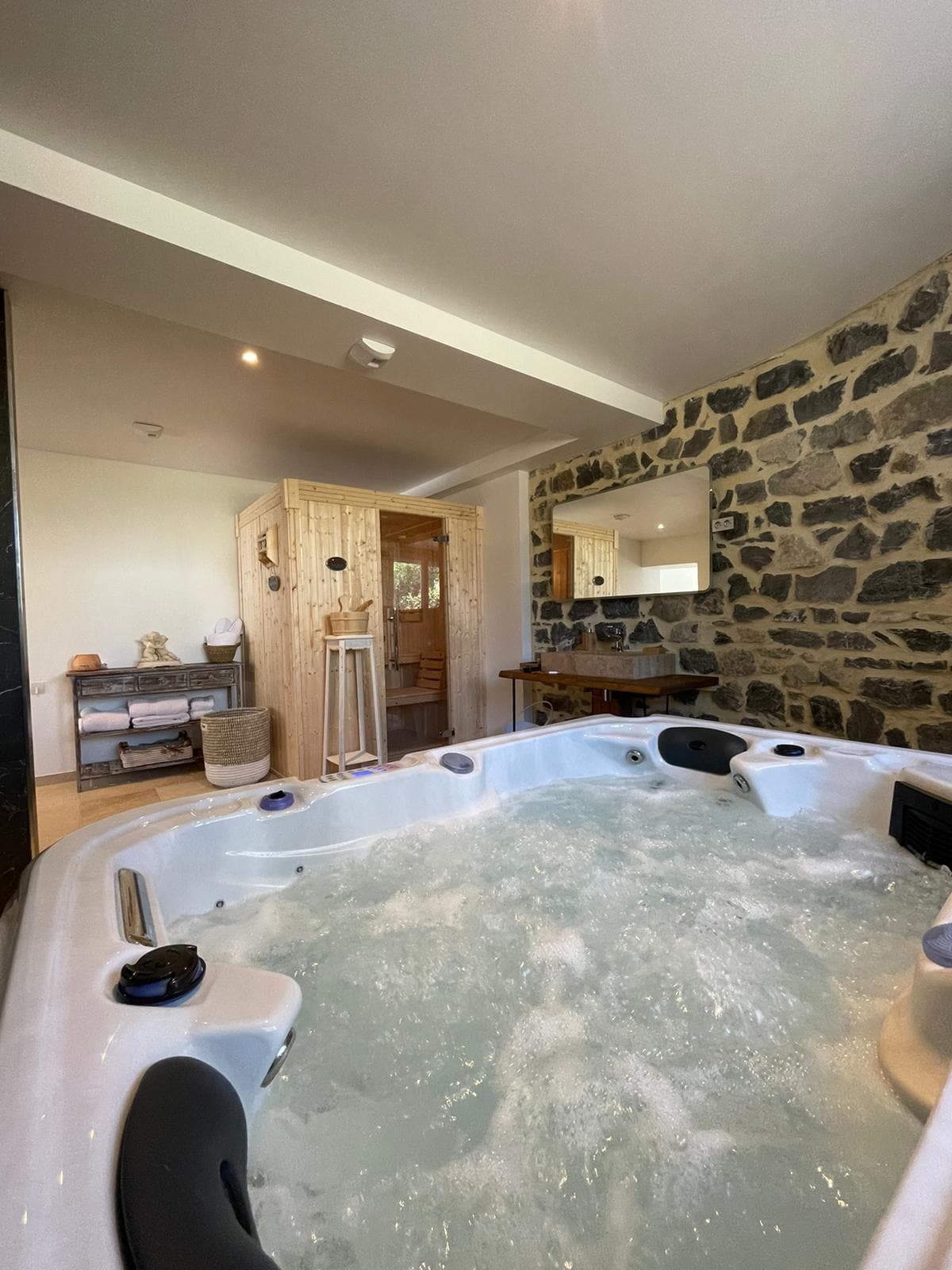 Bienvenido al "Lobo en el Jacuzzi" situado en la región de Pic St Loup. Nuestro estudio de 30 m² ofrece una cama suspendida y una terraza con jacuzzi privado accesible durante todo el año, sin vecinos, que se puede disfrutar con total privacidad Esta habitación acogedora y cálida será ideal para pasar una noche romántica o para un descanso relajante en una decoración muy personal y original. El jacuzzi se puede cubrir cuando llueve. 10% a partir de la segunda noche 25% para 1 semana
