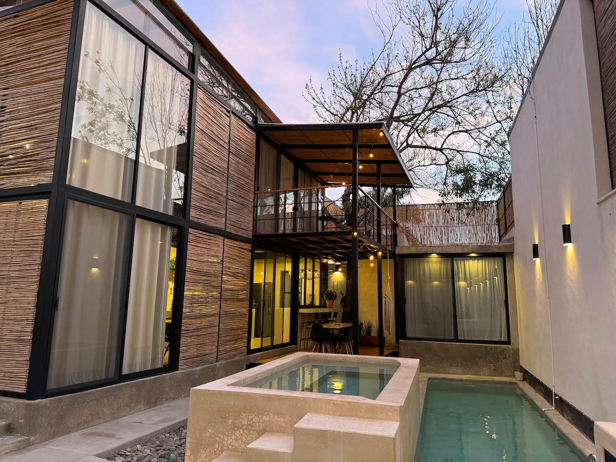 Bienvenido a la nube , un lugar encantador donde podrás pasar noches inolvidables, cuenta con todo lo necesario para una estancia tranquila y a su vez poder disfrutar de su hermoso jardín con iluminación nocturna y una gran alberca climatizada, tratada con sal de mar, para que tu estancia sea placentera. Este espacio forma parte de un conjunto de 3 casas que comparten el jardìn, la alberca, el frontòn y el bosque.