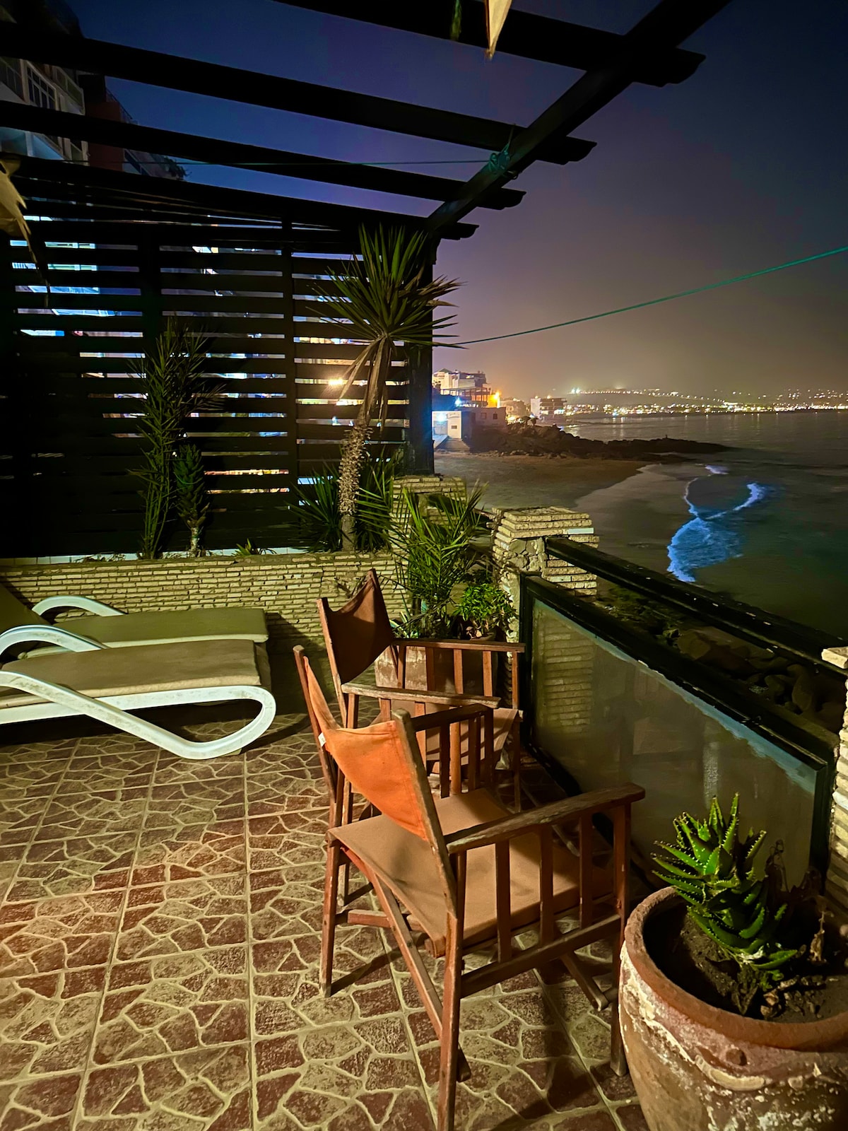 Ubicada en el vibrante y colorido pueblo de Aghroud, Rosyplage es una joya frente a la playa que ofrece impresionantes vistas al mar desde cada habitación. Planta baja: estudio totalmente equipado. El primer piso se siente como estar en un barco con un salón marroquí y un televisor listo para Netflix de 75 pulgadas. Dos dormitorios orientados al mar te esperan arriba. Nivel superior: cocina que conduce a una terraza, seguida de un solárium bañado por el sol ideal para hacer yoga y puestas de sol. Las comodidades modernas se encuentran con el encanto de la costa. Nota: la casa tiene 4 niveles y muchas escaleras no son adecuadas para niños pequeños.