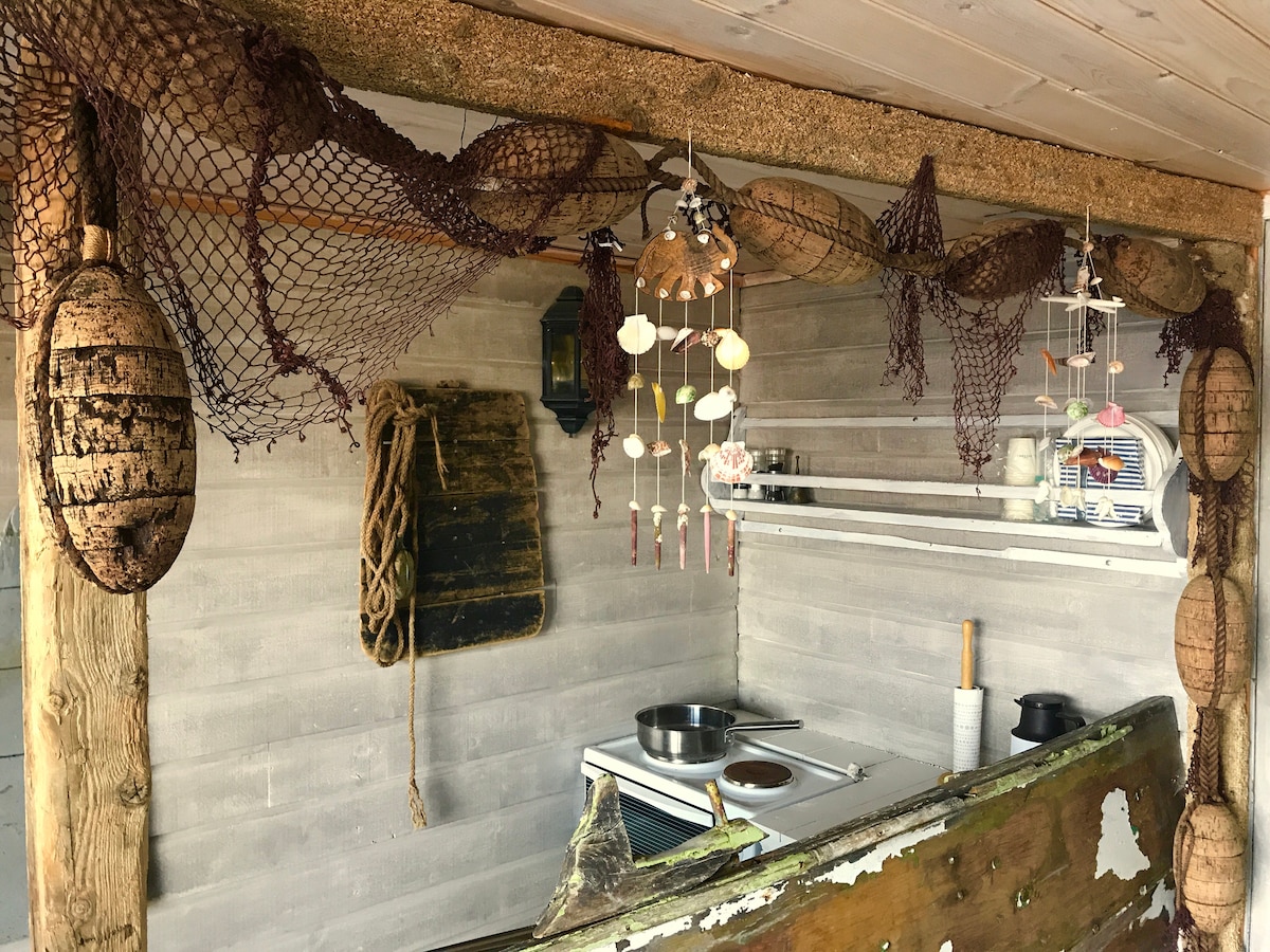 Casa de huéspedes en un hermoso jardín. Disfruta de un entorno sereno en las risas del viento. La bañera de hidromasaje está incluida en el precio y siempre está a 40 grados centígrados. Es muy agradable sentarse en el pisotón cuando hay inclemencias del tiempo afuera. Hay una cama doble encima y debajo del loft, es decir, para 4 personas. La cabaña tiene TV inteligente, cocina y sofá. La cocina tiene una pequeña estufa de encimera con dos placas de inducción en la parte superior. Wifi gratis. El baño está en un edificio separado a unos 7 metros detrás de la cabaña.