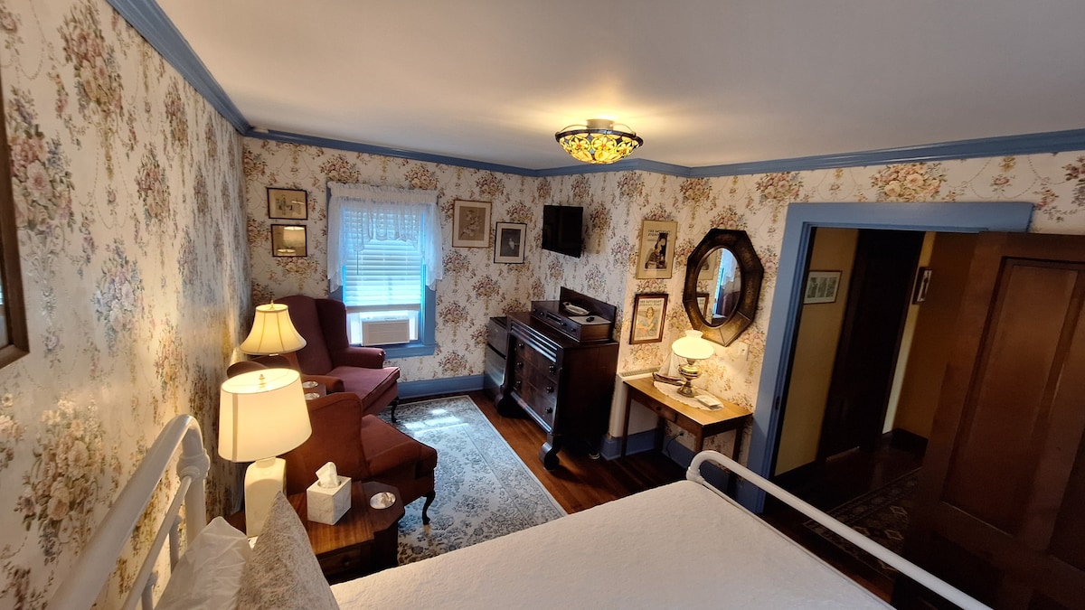 Victoriano restaurado con cariño; corazón de Ellsworth; a 5 minutos a pie de restaurantes/tiendas; patio con fogata; cerca de Bar Harbor/Acadia; lo mejor de ambos: ver lugares de interés de día y de noche junto al fuego/en pubs disfrutando de la verdadera bienvenida de Maine; comparte el primer piso (biblioteca, sala de chimenea, comedor y cocina bien equipada) con otra suite; acceso privado a tu suite; cama tamaño queen. LA TARIFA PUBLICADA ES SOLO 1BR; por favor, envíanos un mensaje para la tarifa 2 BR. Reserva toda la casa/8 huéspedes con otra suite (ver: airbnb.com/h/lodgingsonpinefloralsuite