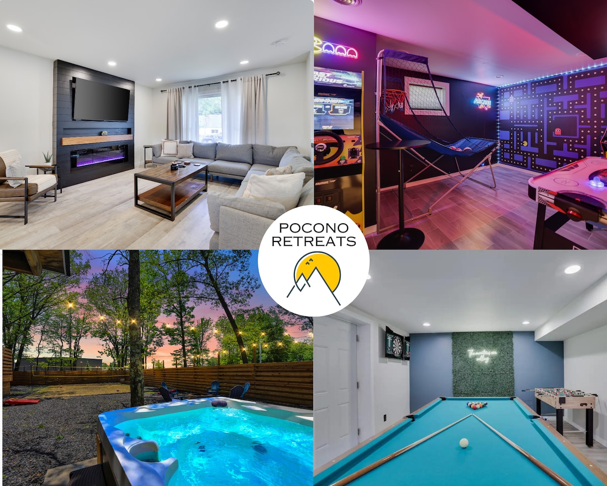 Escápate a una acogedora escapada de otoño cerca de Kalahari, Mount Airy Casino, Crossings Outlets, Lake Wallenpaupack y Tobyhanna State Park a 2 millas de distancia con follaje de otoño y aire de montaña, vistas al lago, vida silvestre y lugares de picnic. Ubicado en una carretera privada escarpada. Este refugio de estilo spa tiene una bañera de inmersión, ducha con efecto de lluvia, luces inteligentes, cocina con estufa inteligente, camas lujosas, espejos LED con sincronización de música y diversión arcade retro. Ideal para parejas, escapadas de cumpleaños o familias que buscan una estancia tranquila en Poconos con comodidades modernas.