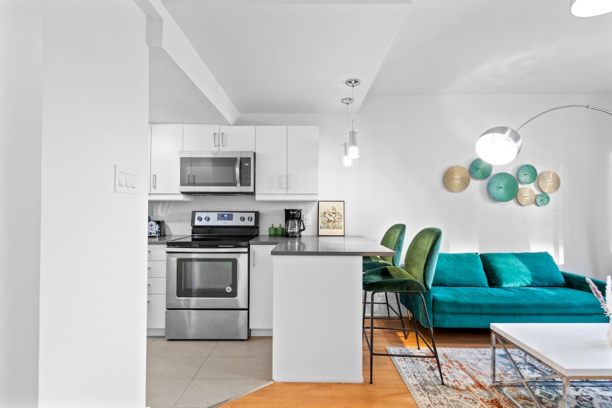 ¡Apartamento situado en pleno centro de la ciudad con acceso directo al Bell Center! Disfruta de tu estancia con lujo y comodidad en un apartamento de un dormitorio totalmente amueblado que incluye café, tostadora, hervidor de agua y todos los utensilios de cocina gratuitos. ¡Sauna, piscina, gimnasio con numerosas pesas y máquinas, salón panorámico, sala de juegos, salón y terraza con múltiples barbacoas a tu disposición! ¡Disfruta de un aparcamiento subterráneo gratuito y de un acceso a 1 minuto al sistema de metro sin tener que poner un pie fuera! Netflix incluido.