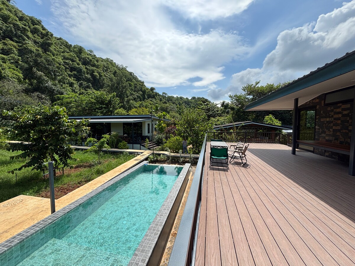 Te damos la bienvenida a nuestra villa con vista a la montaña, una de las tres villas de esta tranquila finca. Rodeado de vegetación y aire fresco, un verdadero escape a la naturaleza. Lo que obtendrás: • 🛏️ Dos dormitorios, cada uno con una cama tamaño king. • 🛋️ Amplia sala de estar con sofá cama y 🎤 karaoke. • Sauna🔥 privada y baño ❄️ frío para una relajación profunda. • 🌳 Patio trasero con vista a la montaña. Los espacios compartidos incluyen: • 🏊 Piscina. • Cocina🍳 al aire libre • Campo de⛳ minigolf • 🎱 Mesa de billar. • 🔥 Fogata y acogedora zona al aire libre