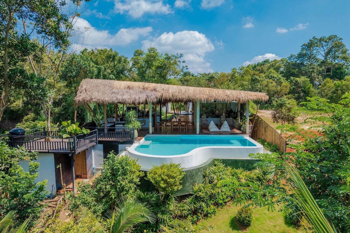 Villa privada con piscina frente a la playa, estilo natural y techo de bambú diseñado ubicado en un exuberante jardín tropical y playa privada. Sentimos el ambiente de Siam y Bali. 2 dormitorios con aire acondicionado, 2 baños, enorme baño romántico tropical y ducha en el cielo de la selva, techo semiabierto para disfrutar de las estrellas por la noche. Todo está hecho a mano y diseñado. Sala de estar semiabierta, cocina, mesa, sofá grande y redes de descanso, creando lugares perfectos para relajarse en cada momento del día. Da la bienvenida a tu próxima experiencia tropical y de lujo.