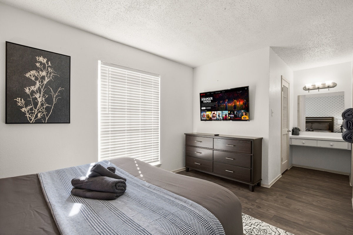 Elegante retiro en Austin con lujosa cama tamaño king y lavadora/secadora